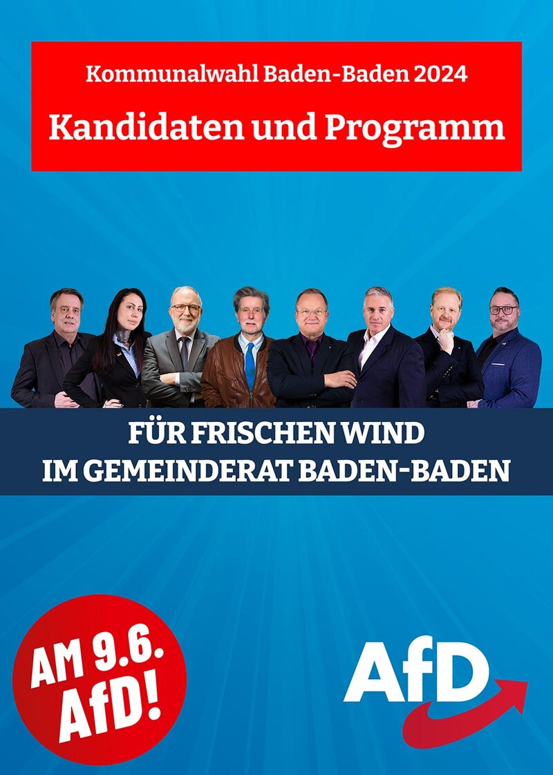 „Die AfD im Gemeinderat von Baden-Baden blickt auf erfolgreiche fünf Jahre zurück. Wir konnten die überteuerte und unnütze 115 Behördennummer abschaffen und brachten die Debatte über den Erhalt des Klinikums in Gang. Durch unsere konstruktive Mitarbeit und unsere Fachkompetenz sind wir ein wichtiger Faktor im Gemeinderat. Wir gehören nicht dem Klüngel der Altparteien an. In den nächsten fünf Jahren machen wir uns unter anderem für den Erhalt des Klinikums in Baden-Baden stark. Mit uns wird es keine Enteignungen von Wohneigentum zur Unterbringung von Migranten geben. Wir werden uns für die Sicherheit unserer Bürger einsetzen und die Instandsetzung unserer Straßen und Plätze angehen. Wie wir dies erreichen wollen und was unsere Ziele sind, stellen wir Ihnen auf den nächsten Seiten vor."